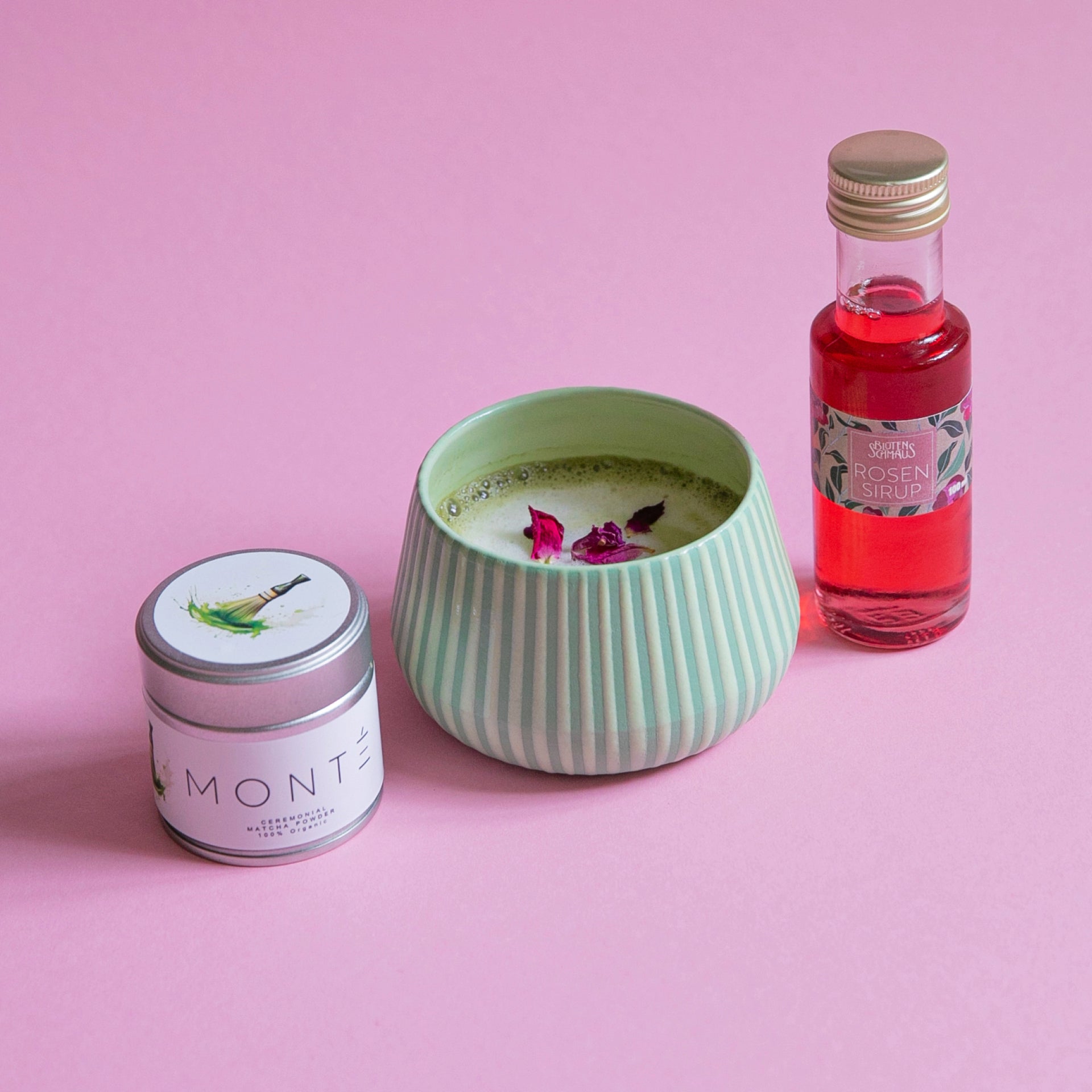 The rose syrup from Blütenschmaus adds a sophisticated floral touch. Just a small splash enhances your matcha with the subtle fragrance of freshly picked rose petals.
